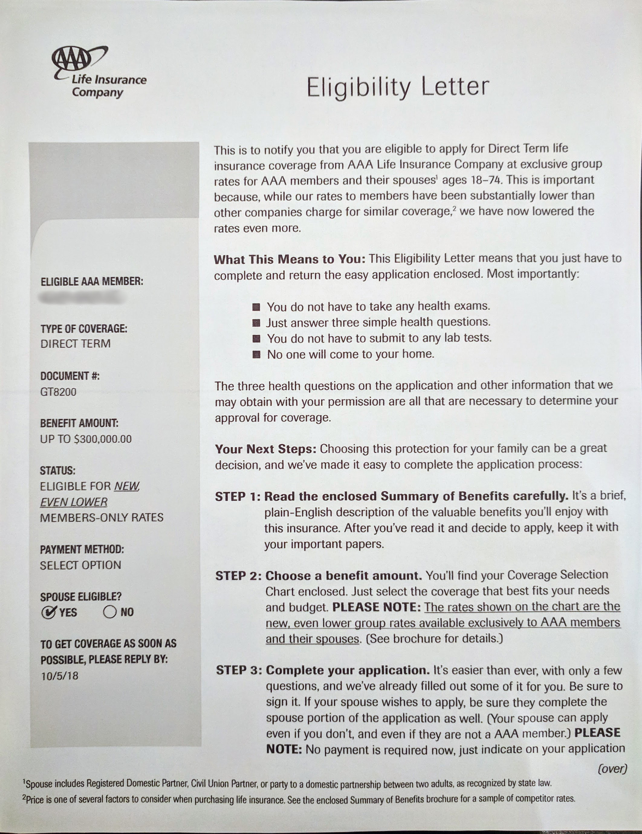 I’m using a life insurance offer sent to me as a sample because it’s a close approximation to typical documents I archive and doesn’t have a lot of personal information on it (some text has been blurred out). Although, it’s not a document I’d normally save.
